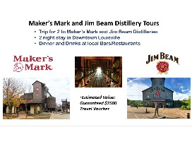 Enjoy a trip for 2 to Maker's Mark and Jim Beam Distilleries. Your two-night stay in Downtown Louisville will be spent not only on the distillery tours, but also at local bars/restaurants, enjoying dinner and drinks.