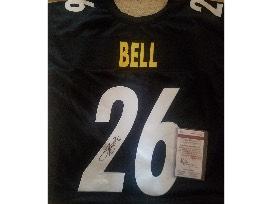 Here we have a Pittsburgh Steelers Jersey, signed by legendary player Le'Veon Bell. In college, he started his career at Michigan State where he was a Big Ten champ in 2010 and an All American in 2012. He was drafted by the Pittsburgh Steelers in 2013, and he is regarded by most as the greatest running back in professional football. Additionally, he was named All Pro in 2014, 2016, and 2017. During his 5 seasons in the league, he has rushed for 35 tochdowns and has 7 receiving.