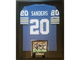 1Here we have a framed Detroit Lion's jersey, autographed by the legendary Barry Sanders. Sanders has been considered by many as the greatest running back of all time. He retired with great records, too: he had the second most rushing yards in the entire history of football.