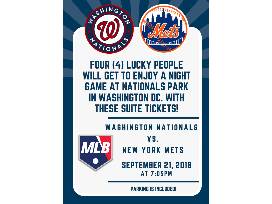 Four (4) lucky people will get to enjoy a night game at Nationals Park in Washington DC. with these suite tickets!