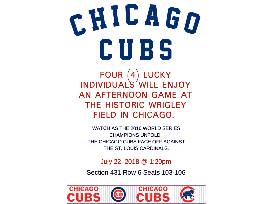 Four (4) lucky individuals will enjoy an afternoon game at the historic Wrigley Field in Chicago. Watch as the 2016 World Series Champions unfold. The Chicago Cubs face off against the St. Louis Cardinals.