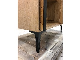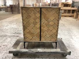 1Package includes: Hand built liquor cabinet made from white oak. Over 100 hand made wood tiles and custom made blackened steel legs. Made with love to benefit the OTAT dogs. 34"x42"x20".