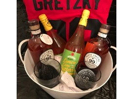 Wayne Gretzky Jersey, 2 bottles of lemon lime & bitters, 2 bottles of Wayne Gretzky Canadian Whiskey, 2 glasses and 2 Wayne Gretzky hockey pucks