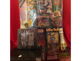 Everything you need to ring in the new year in style...a glittery celebrate sign, giant assortment of fireworks, New Years napkins, champagne, and party kit for ten.