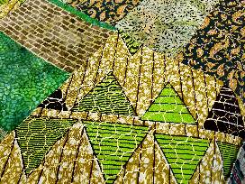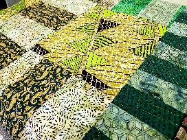 This beautiful quilt is made with gold and green yarn and metallic inclusions. The quilt was handmade by clients at Envision's Westtown Center who used re-purposed materials from discarded sample books at the Merchandise Mart. It measures 6 x 7 feet (74" x 90") and is the perfect accent for any room.