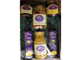 Awesome products from the Olive Cart. This basket includes Mocha Almond Fudge and Espresso flavored olive oil, sweet onion balsamic chutney, spicy pickled baby corn, strawberry zinfandel balsamic jam and jalapeno cilantro mustard.