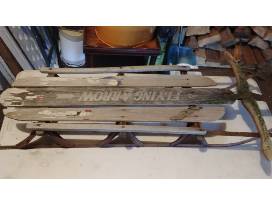 A vintage "Flying Arrow" sled is a perfect imperfectly refinished and re-purposed as a shelving unit.
