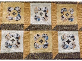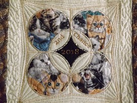 This quilt, made just for the Evening of Pawsibilities, is approximately 52"x70" in shades of brown with a cat theme. Each quilt block is 100% cotton and has 4 circular windows with various cats looking out at you. The sashing colors are meant to look like each one of the blocks is in a cubby hole. The back is an overall print of paw prints, and the bottom left-hand block lists Second Chance with 2018 on it.