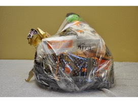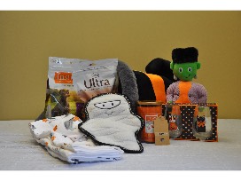 This Halloween-themed gift basket includes a dog bed, paw print dish towels, toys, a Yankee Candle (pumpkin scent), 2 cat Halloween glasses, and treats. Included is a light up cat purse!