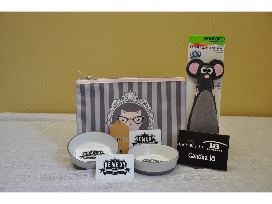 Your kitties will enjoy two cat bowls, brown and cream with cat design, and the Energize catnip felt mouse cat toy.