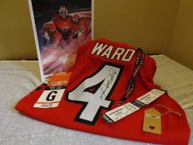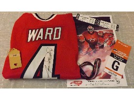 Wear a Hurricanes Jersey signed by Aaron Ward (men's XL home Hurricanes jersey).
