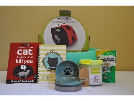 The Luuup litter box will make your life easier thanks to its innovative 3-sifting-tray system! Your cat will love it thanks to its pet-friendly anti-microbial coating, a larger litter area, and a spill guard. The Luuup comes with a pair of blue, grey, and copper pet bowls with paw print design, a Flip-Tite pet storage container by Felli (holds 31 oz.), a "Purrfect" yellow striped cat notebook, a ladybug crinkle cat cave from Pet Rage US Designs, a fun "How to Tell if Your Cat is Plotting to Kill You" book, and an "egg-cersizer" cat treat dispenser.