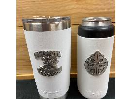 Handcrafted wood crate with the Oak Grove Logo, created by Gabriel Metal Casting; contains one bottle of Tequila, one bottle of Huckleberry Vodka, 2 white Yeti mugs with Handcrafted metal Oak Grove and Grover Logos. Measures 14"h x 13"d x 15"w."