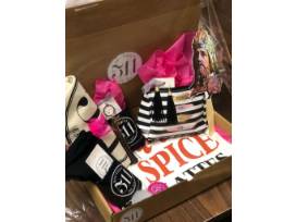 Makeup pouch, for puff key chain, brown tassel key chain, black tassel earrings, black boot socks, and "You had me at pumpkin spice" size medium tee.