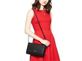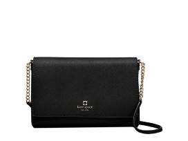This fabulous cross-hatch Saffiano finished leather crossbody purse in black is extremely versatile and can be worn day or night. With 14-karat light gold plated hardware, flap top accented with Kate Spade logo and cutout spade secures with a magnetic closure. The single leather and chain shoulder and crossbody strap has a 22 inch drop and the bag measures approximately 9.9" x 6.5" x 2". Inside lining has a surprise pop of hot pick custom coordinating Capital Kate logo jacquard lining with inner zippered pocket and an open slip pocket. The perfect bag for that perfect lady!