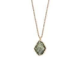 Simple yet bold, the Kalani Gold Pendant Necklace in Sage Mica is a shining statement. This 32" pendant necklace features a geometric center framed in metallic detail, set on a metallic chain. Also included are the matching Dunn Gold Drop earrings in Sage Mica. Set is 14K Gold Plated Over Brass. Donated by designer, CEO, and philanthropist, Kendra Scott as part of her Kendra Gives Back Program.