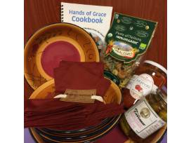 Romance Nanette Vacher Ambiance hand-painted pasta serving collection including 13" serving bowl and 4 - 9" pasta bowls; 6 buffet napkins; Tarall'Oro bag of Pasta; Borgo de Medici Marinara Pasta Sauce; Torremar Mediterranean Cocktail Olives and a Hands of Grace cookbook from Good Shepherd Gracenter.