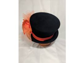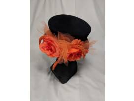 Black velour felt hand blocked men's or women's top hat. Decorated with orange chiffon band, large orange flowers, orange netting and natural orange dyed dried flowers.
