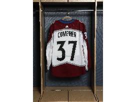 J.T. Compher Colorado Avalanche white jersey worn during games played from December 21, 2017- February 24, 2018. Jersey has repairs on both sleeves. Size 56. Sales tax will be added to your final bid and shipping charges may apply. If a bid is placed in the final 30 seconds of the auction, the close time will extend another 30 seconds until no bids have been placed in that timeframe.