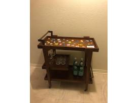 Serve it up with style and meaning. This Midcentury Modern Serving Cart's dark tobacco wood finish, aged brass handle, open shelving, and locking castors will stop traffic at your next soiree. Topped with original artwork by the 3rd grade class, the collaborative collection of artistic houses remind us of the African proverb "It takes a village to raise a child, find a village, encourage one another and open your village to others." The serving cart is topped with glass for protection. Donated by the 3rd Grade Class. Value: Priceless