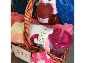 Two Pink Moscato wines, one bottle of Kinky Red, a tutu, socks, scarf, cup, and an XL Breast Cancer Awareness tee shirt. Also included is a $65 Express Facial gift certificate from Medical Aesthetics. $185 value.