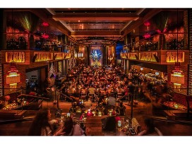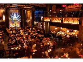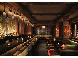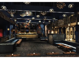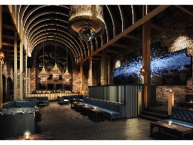 massive 10-foot bell and disco ball. The two nightclubs are separated by an operable wall that transforms the space into a