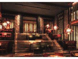 dining" experience. Diners enter the 275-seat space through a dramatic grand staircase that leads to the subterranean main