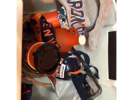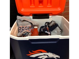 Broncos travel coffee cup, Broncos bag, broncos magnet, Broncos growler, Reusable shopping bag, Tshirt, football drink guy cup. 2 tickets to the December 30th Broncos game against the San Diego Chargers. All in a large rolling cooler!
