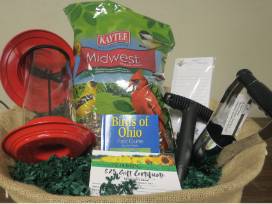 Our Birds and Blooms Basket includes hummingbird feeder and metal bird feeder from WildBirds Unllinted; Bloomin' Garden Center gift certificate; as well as bird seed, garden tools, and other nature-inspired goods.