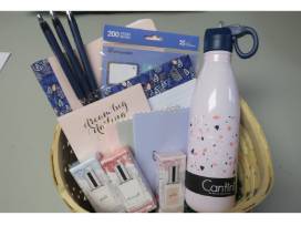 A precious collection of pastel products including three of Philosophy's famous perfumes, an insulated Cantini water bottle, and assorted desk products to integrate a touch of elegance into her busy life.