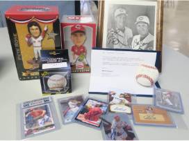 2 Reds Tickets Section 129 Row Q Seat 1-2. Also included: Pete Rose and Joey Votto bobbleheads; signed cards from Barry Larkin, Jose Rijo, Sean Casey and others; signed balls from Tom Browning and David Hernandez, and a signed photo of Bret and Bob Boone. Courtesy of our friends at PNC Bank and David and Amy Beckett.