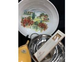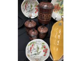 Enjoy a great pasta dinner "Made in Italy". Large platter, 2 small spaghetti bowls, leaf shaped dish for bread. Keep stuff fresh in the copper canisters and much more!