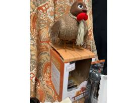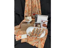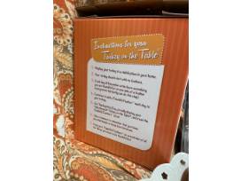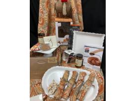 Enjoy sharing special sayings by writing them on the feather of this turkey centerpiece. Look at the turkey napkin rings and special place cards. Check out the "leftover" bags, Turkey platter, gravy, baster set, and so much more! All items are placed on this festive fall tablecloth with matching napkins. Can't pass this one up!