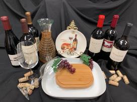 It's always time for wine. This package includes wine and cheese platter, decanter, 6 wine glasses, and a wonderful set of wine bottles.