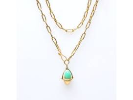Necklace details: a 14ky gold-dipped, 1.5mm hammered link necklace features a natural chrysoprase cabochon pendant with a secret screw-off compartment and double-sided snake clasp; total length is 33 inches, looks great worn long or doubled.
