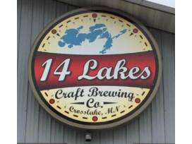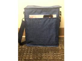 Thirty-one picnic thermal tote in retired print Blue Crosshatch and two 14 Lakes empty growlers.