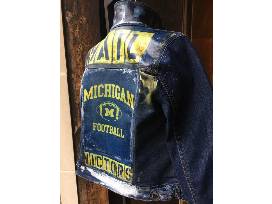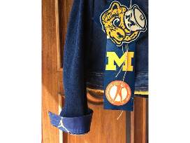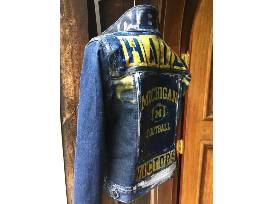 This Michigan inspired custom jacket created by Cynthia Zordich, is the perfect addition to any Michigan woman's wardrobe. Made utilizing heat transfer, medium and textile paints, this hand made jacket includes text, graphics and colors reflective of the Michigan Wolverines. If that wasn't enough...it's also autographed by UM Head Football Coach, Jim Harbaugh! Package also includes 2 tickets to Michigan's homecoming game vs' Maryland on Oct. 6th!