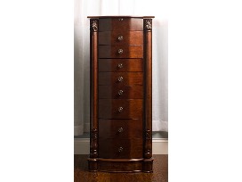 Hives and Honey Henry IV walnut jewelry armoire has a rich antique walnut finish applied by hand in a multiple step process by a team of artisans. Its has 8 lined and padded drawers to keep small items organized. It has 20 hooks for necklaces in 2 tiers, mirror and ring rolls.