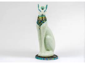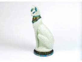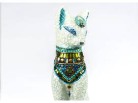 DESCRIPTION: The regal bearing of the cat form inspired Anne, reminding her of an Egyptian Queen. The form is mosaiced in frosted white iridescent tile for the body and for adornment, has shimmering gold, deep olive green, genuine turquoise and faceted Swarovski crystals for a stunning collar worthy of a goddess of her stature