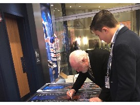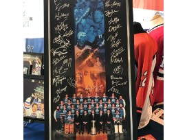 1985 Team Signed Collage Banner with picture of 85 Stanley Cup Champion Team. Hand signed by the 84-85 Edmonton Oilers.