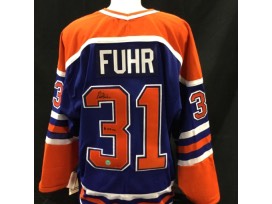 Grant Fuhr Edmonton Oilers Signed 1988 Vezina Inscribed Blue Retro CCM Hockey Jersey