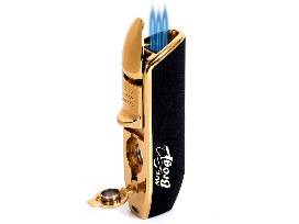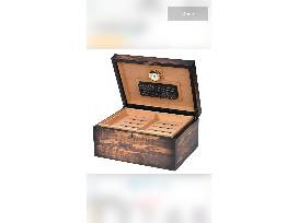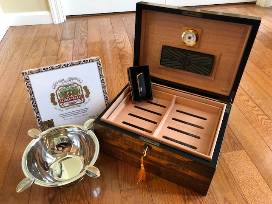 Dark Brown Humidor with reclaimed wood finish, silver cigar ashtray, triple-torch cigar lighters, box of 20 Arturo Fuente Cigars.