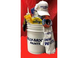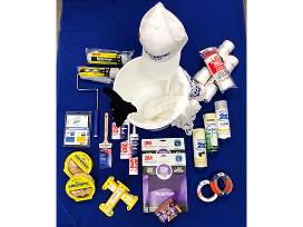 2 - 9" paint rollers and a frame including a cleaning glove, 2 ½" angular firm paint brush, 3 - 10 oz. tubes of white siliconized/latex sealant, roll of scalloped and a roll of waved tape, 2 rolls of Scotch blue painters tape, painters helpers kit with industrial strength cleaners, 2 rolls, plus a 9ft X12 ft. sheet of plastic drop clothes, 2 SureStand door stands, 3M X-fine sanding sponge plus two packages of medium sandpaper, 12oz. Rust-oleum spray can of almond appliance epoxy, 12oz. almond colored spray paint/primer, 12oz. clear matte spray, 2 Kelly Moore white t-shirts (medium and large), all in a 5-gal. bucket