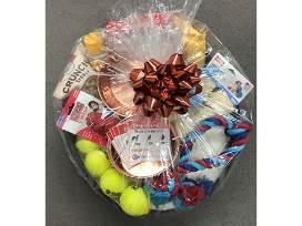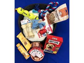 Pet bed, Burt's Bees oatmeal dog shampoo and hypoallergenic wipes, 24 oz. Milk -bone snacks, copper water and food bowls, Boots and Barley beef hide bones, 10oz.Nutro peanut butter crunchy treats, Kong classic medium chew toy and 4 squeakair tennis balls, red and blue rope toy, elephant chew toy, 5 save my pet emergency stickers
