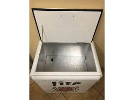 Miller Lite beer promo cooler with bottle opener and cap receptacle on the side. 24" x 16" x 35"