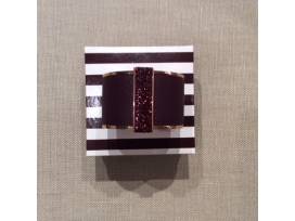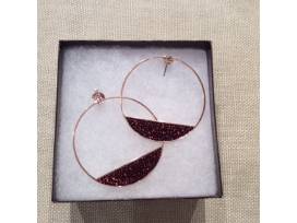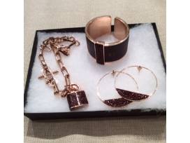Henri Bendel rose gold necklace with sparkly lock pendant, large hoop earrings with sparkly purple half moons, and leather bracelet with sparkly purple accent.