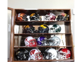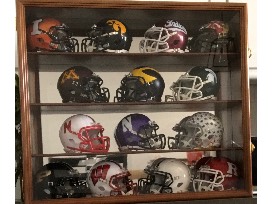 An entire set of Riddell's current NCAA Big Ten Speed Mini helmets. You will receive a helmet for each team in the Big Ten for a total of 14 helmets and a display case for them.