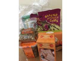 Enjoy a basket of seasonal treats from Trader Joe's! Snacks include plantain chips, pumpkin biscottis, spiced pumpkin seeds, and more!