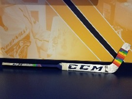 Preds Pride Night stick used during tonight's warm ups autographed by #74 Juuse Saros