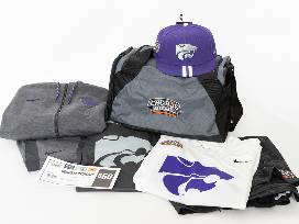 Get your very own K-State Cactus Bowl Football gear that all the players wear! Package includes purple hat, gray shorts, gray long-sleeve shirt, gray sweatpants, gray jacket (not embroidered with Cactus Bowl logo), white short-sleeve dri-fit t-shirt, and a duffle bag all embroidered with the Cactus Bowl logo. Complete the look with a $50 Dick's Sporting Goods gift certificate! Also included is a Cactus Bowl stamped football to commemorate the game.